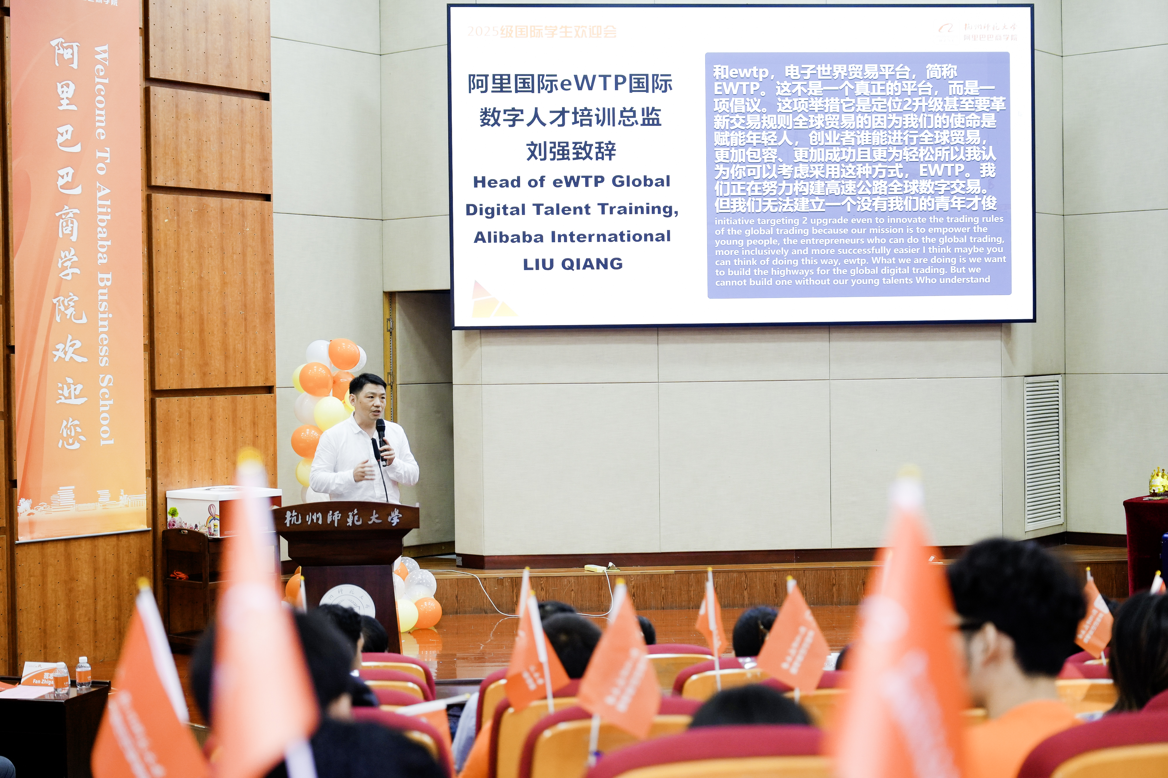 在印尼学生乐队吉他弹唱的悠扬旋律和卢旺达传统舞蹈的热情碰撞后,欢迎仪式正式拉开帷幕。阿里巴巴商学院执行院长章剑林致辞。他代表学院对2025级国际新生的到来表示热烈欢迎,随后结合商学院的发展历程,详细介绍了学院的办学定位和特色,并提出三点希望:第一,希望新生们把商学院当作自己的“国际创业合伙人”;第二,希望新生们启动“跨文化数字操作系统”:升级认知系统、实践系统以及升级责任系统;第三,希望新生们预装“与世界共成长”插件,书写属于自己的国际传奇。刘强代表阿里集团,结合阿里在数字经济、跨境电商领域的实践经验,为新生们解读行业发展趋势,并表示阿里集团将持续为商学院国际学生提供实践支持与发展平台,助力大家将理论知识转化为实际能力。