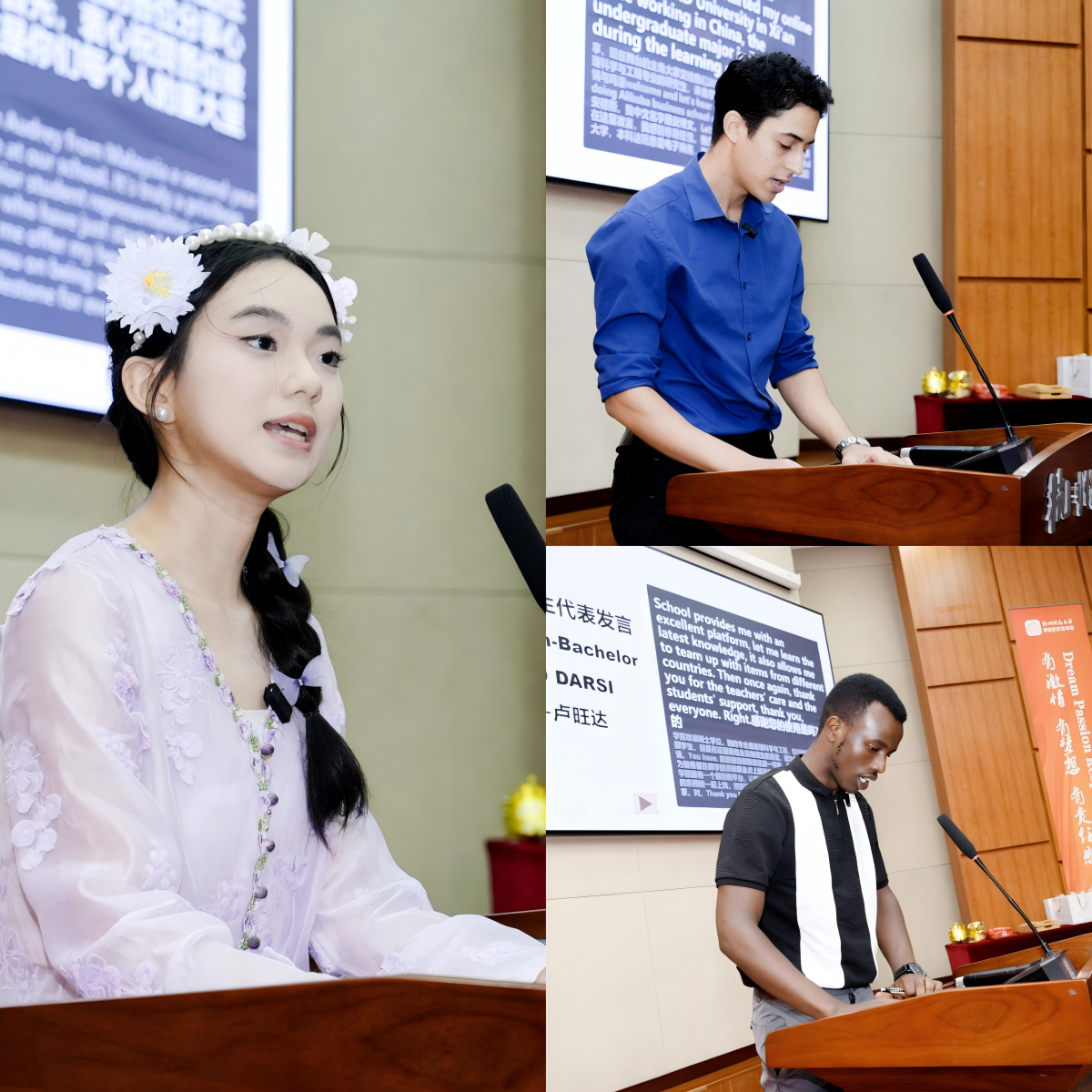 老生代表、来自马来西亚的刘璟LAU AUDREY分享了自己在商学院的学习与生活经验,从学业平衡、活动参与到资源利用,为新生提供了实用建议;研究生新生代表、摩洛哥学子安伯文ABOUFIRASS ANASS与本科生新生代表、来自卢旺达的达西SANO DARSI则先后发言,表达了对未来学习生活的期待,以及融入中国文化、深耕专业领域的决心,真挚的话语引发在场师生共鸣。