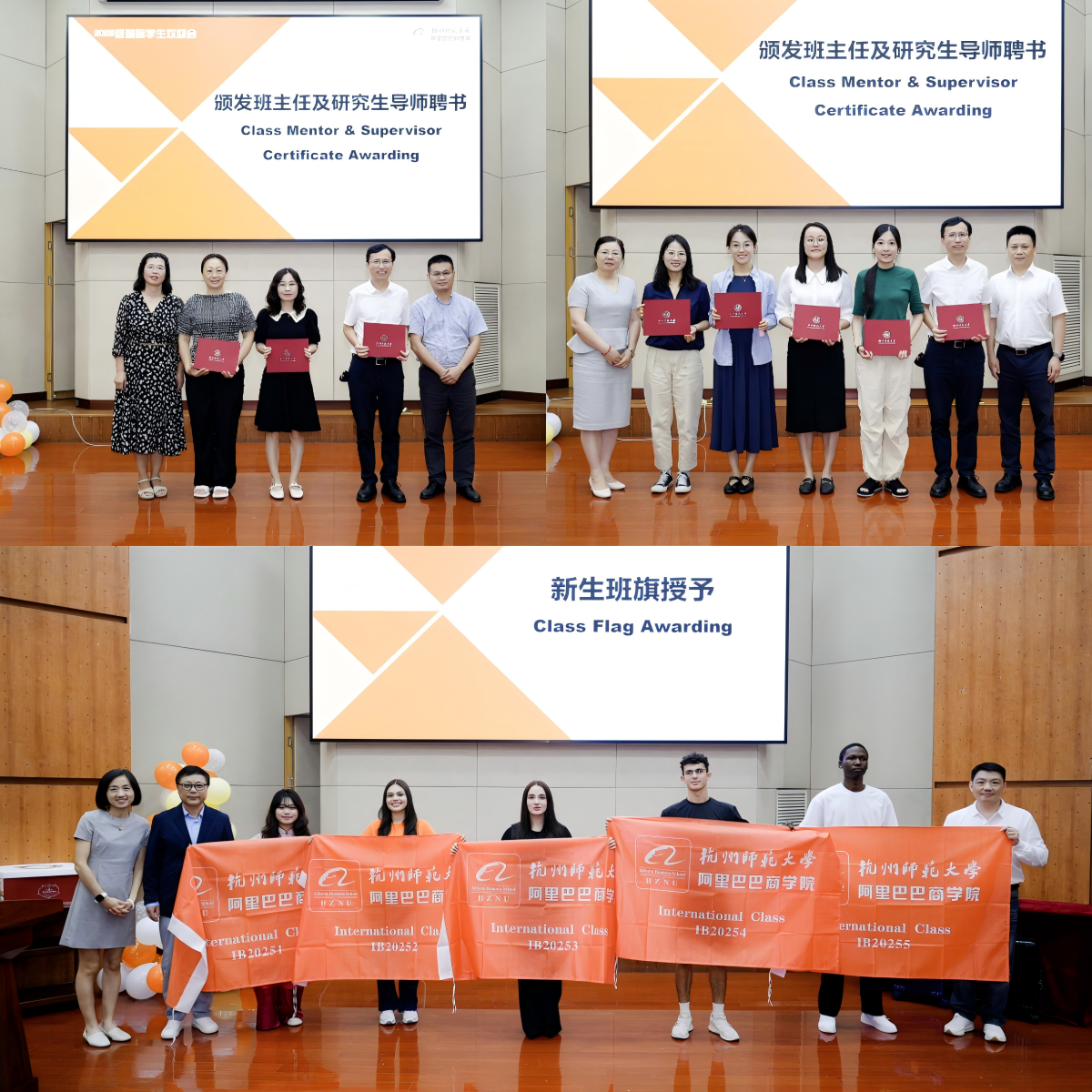 全体国际新生本科班主任及研究生导师上台领取聘书,他们承诺将用心陪伴新生成长,为大家解决学习生活中的难题;各班代表从学院领导手中接过象征班级精神的班旗,标志着国际新生班级正式组建,也让新生们感受到强烈的集体归属感。