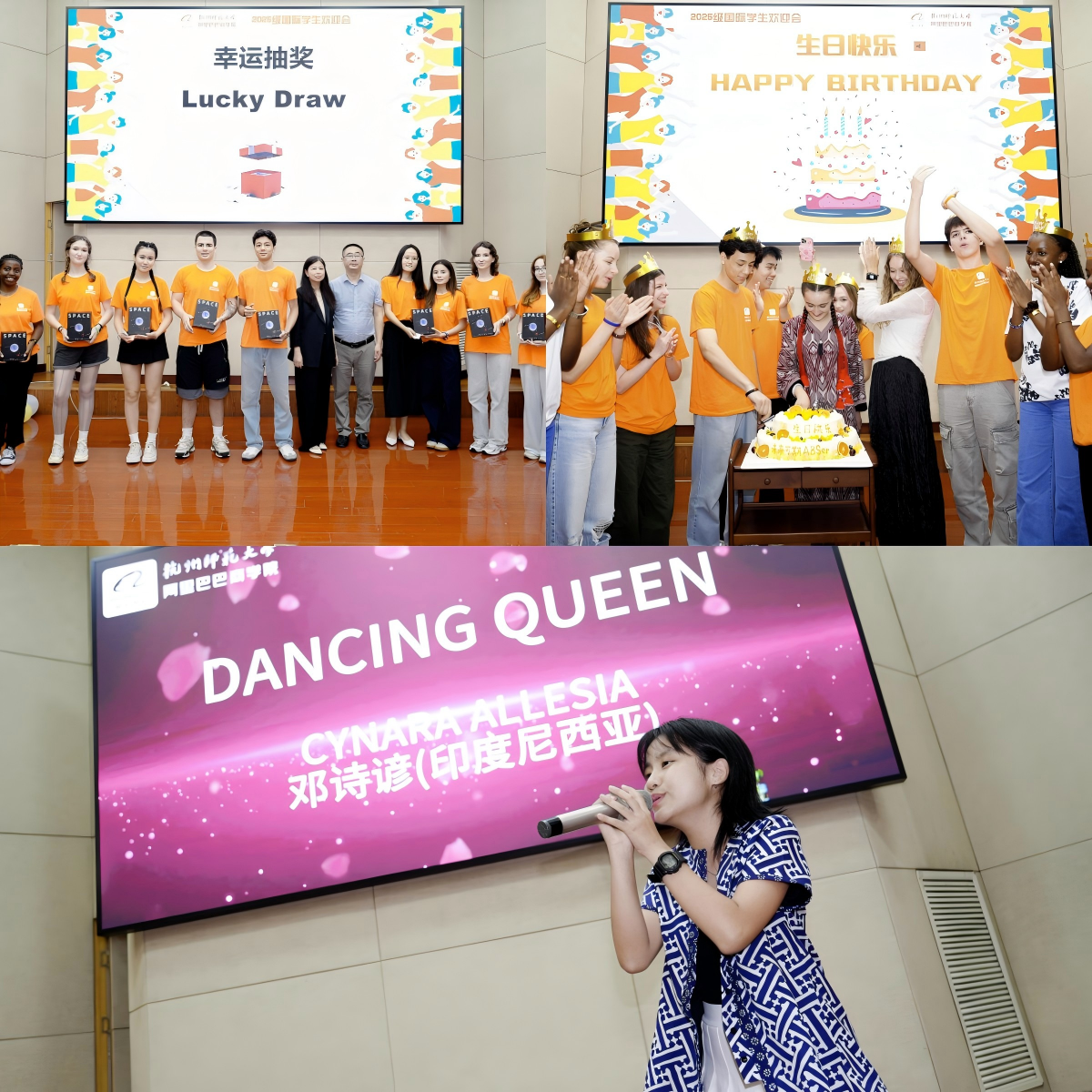 值得一提的是,欢迎会特别设置了“九月集体生日”环节和抽奖环节。工作人员推出生日蛋糕,全场师生共同唱响生日歌,为九月过生日的国际新生送上祝福,温馨的场景让远离家乡的学子们感受到家的温暖。抽奖环节则一次次将活动推向高潮,诞生数名幸运儿,现场欢呼声不断。最后,印尼新生带来经典歌曲《Dancing Queen》演唱,动感的旋律与热情的表演为欢迎会画上圆满句号。